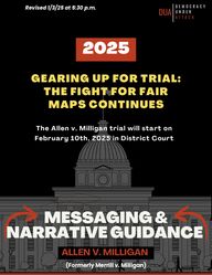 DUAD E M O C R A C YU N D E R A T T A C KMESSAGING &NARRATIVE GUIDANCE ALLEN V. MILLIGAN (Formerly Merrill v. Milligan)Revised 1/3/25 at 5:30 p.m.GEARING UP FOR TRIAL:THE FIGHT FOR FAIRMAPS CONTINUES2025The Allen v. Milligan trial will start onFebruary 10th, 2025 in District Court
